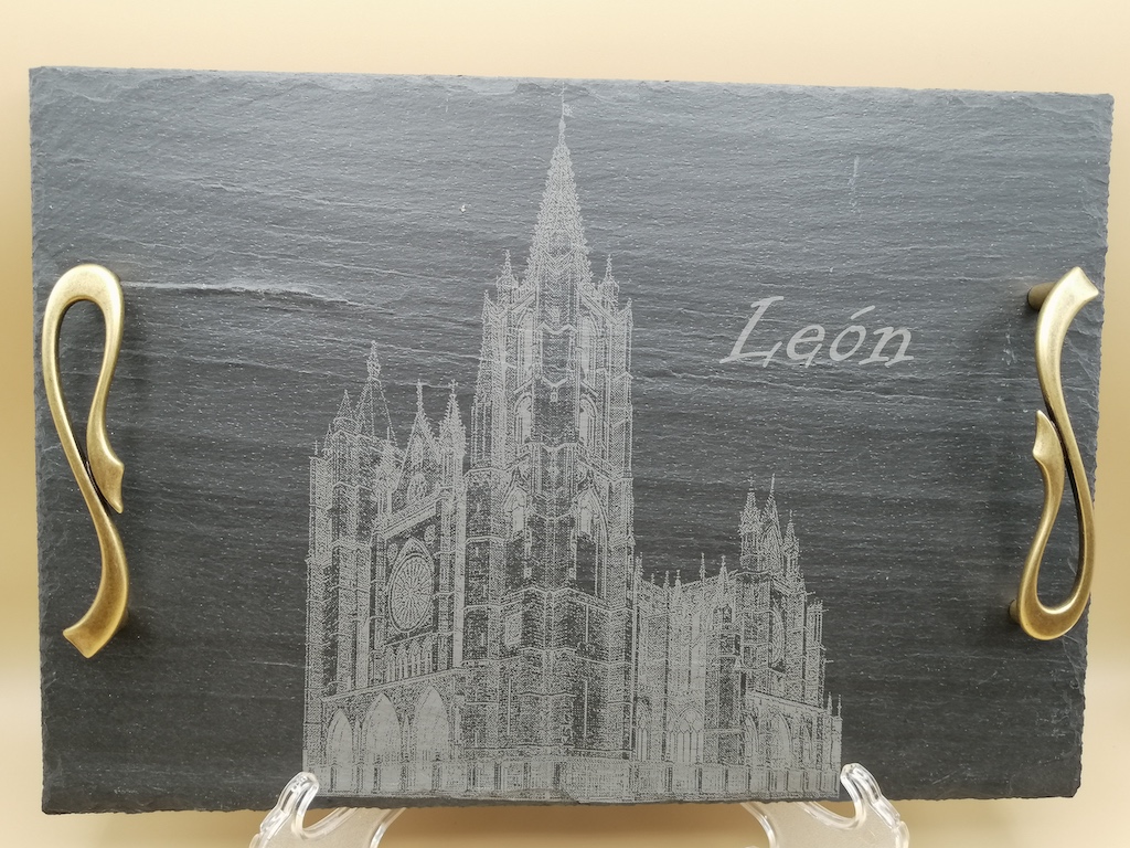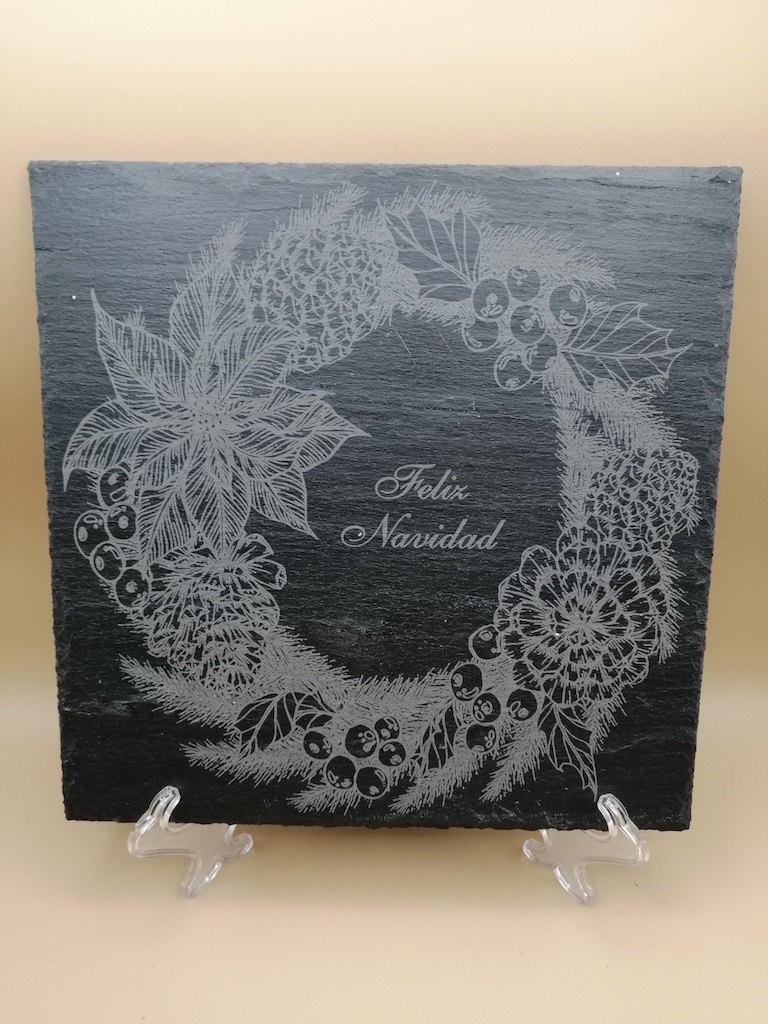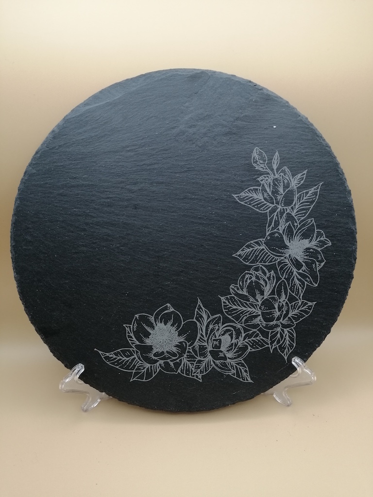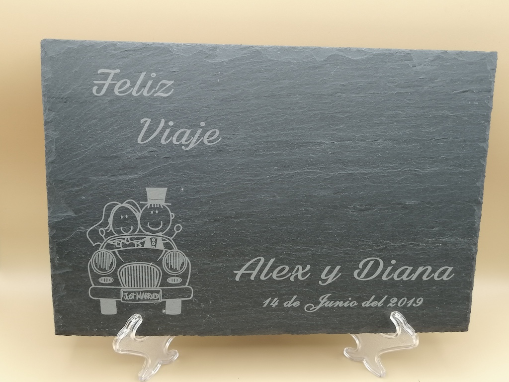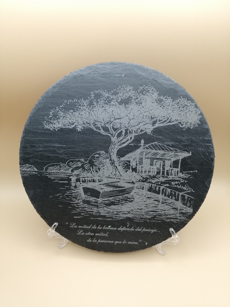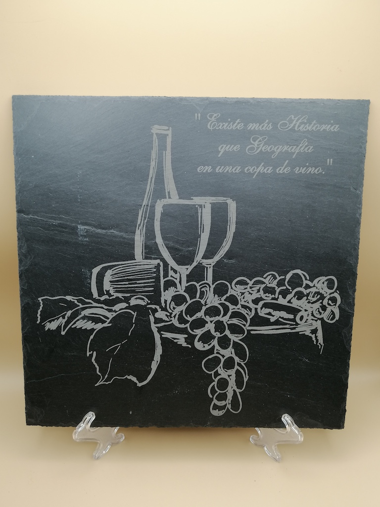 Grabado láser sobre pizarra, donde se puede personalizar con cualquier tipo de dibujo, logotipo. Cuadradas, redondas, bandejas con o sin asas.